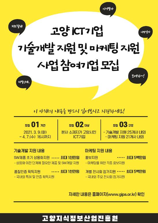 고양지식정보산업진흥원(원장 오창희)은 고양시 ICT(정보통신기술) 기반 창업·중소기업 육성을 위한 ‘고양 ICT기업 기술개발 지원사업’, ‘고양 ICT기업 마케팅 지원사업’ 참여기업을 모집한다.