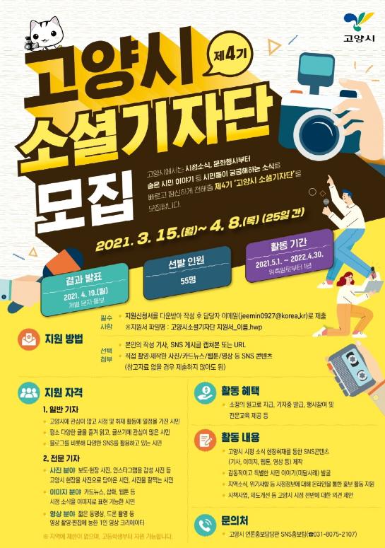 고양시가 ‘제4기 고양시 소셜기자단’ 55명을 오는 15일부터 4월 8일까지 선발한다.