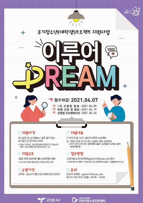 고양시청소년재단 청소년진로센터에서는 4월7일까지 후기 청소년(20대)들의 꿈을 위한 도전, '이루어Dream' 에 참여할 청소년을 모집하고 있다.