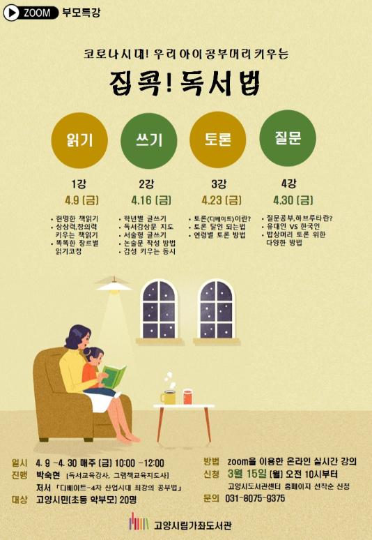 고양시 가좌도서관은, 코로나19로 아이들의 학습 공백 증가와 독서교육에 고민이 많은 초등학생 학부모들을 위해 ‘코로나 시대! 우리 아이 공부머리 키우는 집콕! 독서법’을 운영한다.
