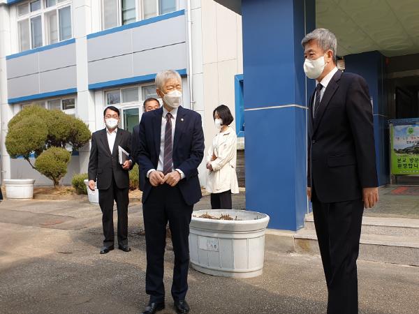 파주교육지원청 관계자 및 이진 경기도교육위원은 3월 15일 법원여중을 방문하여 체육관 건립현황을 점검하고 학교 현안사항을 청취했다.