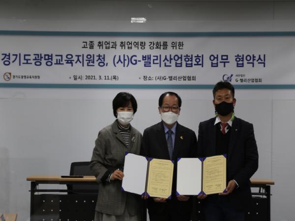 경기도광명교육지원청과 사단법인 G-밸리산업협회는 지난 11일 ‘고졸취업지원 시스템 구축’ 업무 협약식을 맺었다. 협약대상자인 (사)G-밸리산업협회는 금천, 구로, 가산 등에 1만 7,000여 개의 기업이 입주한 건물운영단이 회원으로 있는 협회로, 이번 협약을 통해 광명교육지원청과 ▲(사)G-밸리산업협회 회원 기업의 고졸 채용 정보 제공, ▲특성화고등학교 NCS교육과정 및 취업역량 강화를 위한 지원시스템 구축, ▲고졸(일반고 포함) 진로개발 및 역량강화를 위한 맞춤형 멘토링 제공 등 관내 고졸자들에 대한 원활한 취업 지원 방안 마련을 약속했다.