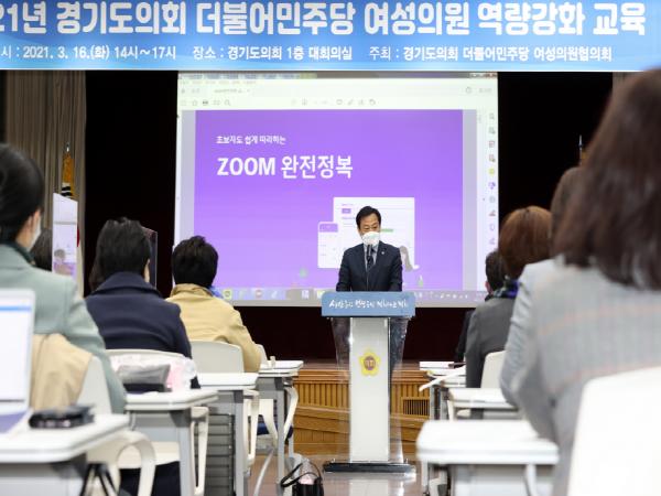 장현국 의장은 16일 오후 의회 대회의실에서 열린 ‘2021년 경기도의회 더불어민주당 여성의원협의회 역량강화 교육’에 참석해 “의원들이 선제적으로 양성평등에 대한 우리사회의 이해와 공감을 확산하고 실천과제를 강구해야 한다”고 말했다.