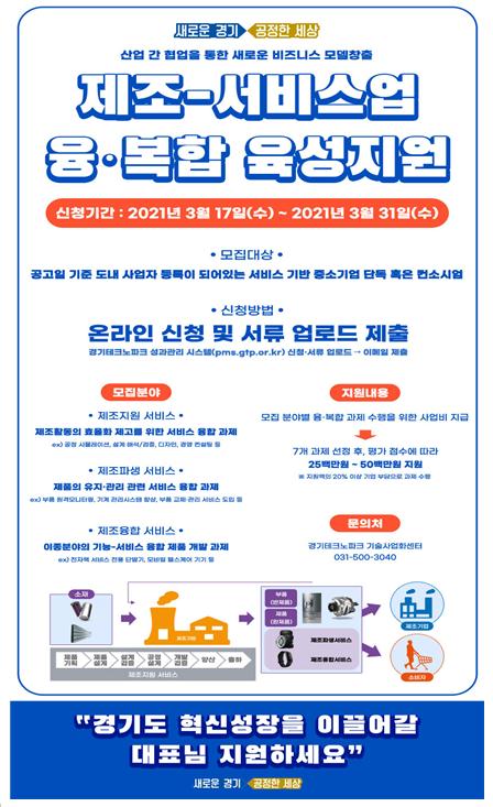 경기도는 이 같은 내용의 ‘2021 제조-서비스업 융복합사업 육성·지원’을 추진, 참여 중소기업을 모집한다고 17일 밝혔다.