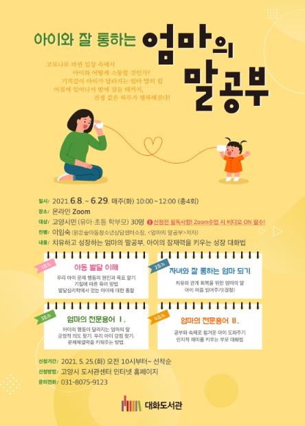 고양시 대화도서관은 부모와 자녀가 올바르게 소통할 수 있도록 돕는 부모교육 프로그램 ‘엄마의 말공부’를 6월 8일부터 운영한다.