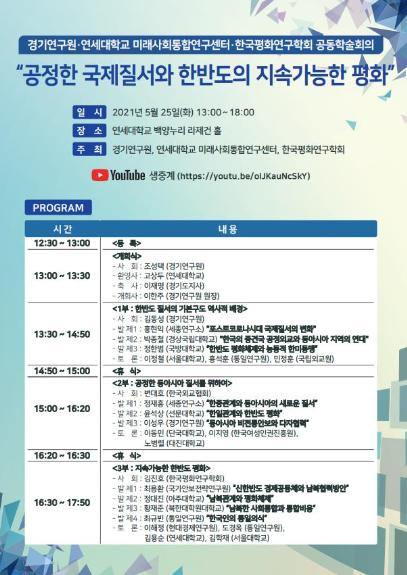 경기연구원이 연세대학교 미래사회통합연구센터, 한국평화연구학회와 함께 25일 오후 1시 연세대학교에서 ‘공정한 국제질서와 한반도의 지속가능한 평화’를 주제로 공동 학술회의를 개최한다.