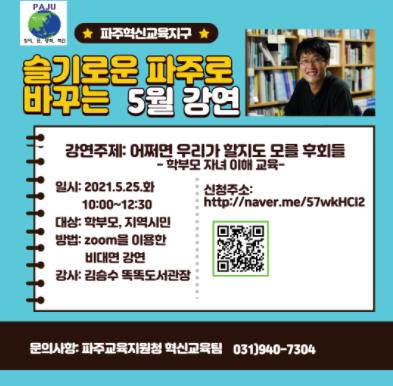 슬기로운 파주로 바꾸는 5월 강연은‘어쩌면 우리가 할지도 모를 후회들’이라는 주제로 학부모 및 지역시민 100명을 대상으로 온라인강연으로 진행된다.