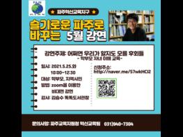 파주교육지원청은 5월 가정의 달을 맞아 2021년 5월 25일 관내 학부모, 파주시민이 참여하는 혁신교육지구 추진과제4-3. 미래교육아카데미‘슬기로운 파주로 바꾸는 5월 강연’을 개최한다고 밝혔다.