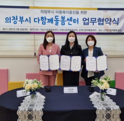 지난 3월 3개소 센터의 대표가 의정부시 다함께돌봄센터간 업무협약을 맺고, 아동의 복지프로그램 공유, 재난 발생시 유기적인 협조체제 구축 및 상호 협력, 복지자원 정보 공유, 지역복지 활성화를 위한 후원 및 홍보사업 연계, 그밖에 아동복지증진을 위해 필요한 사업들을 서로 협력해 아동들이 보다 더 행복한 삶을 누릴 수 있도록 하기로 했다.