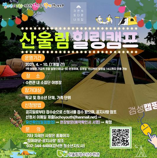 산울림 힐링캠프는 10월까지 반일형, 당일형, 1박형으로 운영하고 있다. 참가를 희망하는 학교·청소년단체 또는 가족단위는 홈페이지나 전화로 신청할 수 있다.