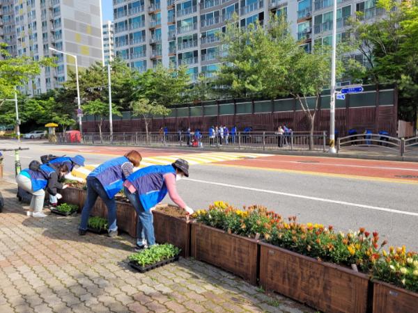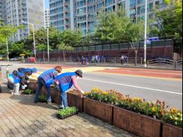 의정부시 송산2동 주민센터는 5월 26일 용민로 및 용현로 일대의 대형화분에 백일홍 모종 2천944본을 교체 식재하는 아름다운 꽃길 가꾸기 2차 행사를 실시했다고 밝혔다.