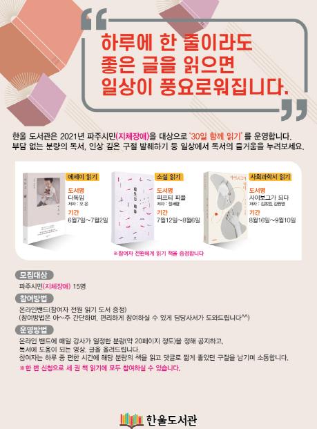 파주시 한울도서관의 이번 지체장애인 독서문화프로그램은 5~9월에 걸쳐 총 3권의 책을 온라인 밴드를 통한 ‘30일 함께읽기’ 방식으로 진행한다. ‘30일 함께읽기’는 온라인 밴드를 통해 참여자들이 지정한 도서를 한 달 동안의 읽기 스케줄에 따라 함께 천천히 끝까지 읽고, 매일의 독서 감상을 나누는 프로그램이다.
