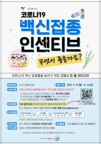 고양시가 코로나19 백신 접종 부작용에 대한 시민들의 불안을 해소하고 백신접종률을 높이기 위해 오는 13일까지 ‘백신접종 인센티브 한 줄 아이디어’시민 공모를 진행한다.
