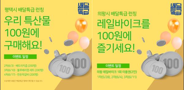 경기도주식회사는 오는 3일과 4일 평택과 의왕 거주 배달특급 회원을 대상으로 100원딜 2차 이벤트를 전개한다고 2일 밝혔다.