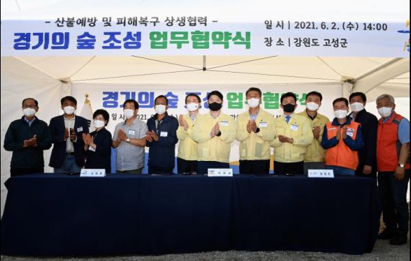 경기도와 강원도, 강원 고성군은 2일 오후 고성군 토성면 성천리 마을 산불피해지 현장에서 이 같은 내용을 골자로 한 ‘산불예방 및 피해복구 협력을 위한 업무협약’을 체결했다.