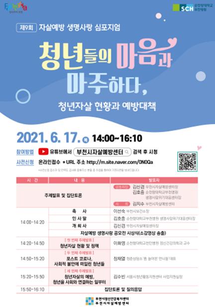 부천시는 오는 17일 ‘청년들의 마음과 마주하다, 자살 현황과 예방대책’이라는 주제로 제9회 자살예방 생명사랑 심포지엄을 유튜브 생중계로 개최한다고 밝혔다.