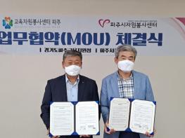 이날 파주교육지원청 교육자원봉사센터(센터장 윤송근)와 파주시자원봉사센터(센터장 연진흠)는 코로나19 감염 예방을 위하여 최소 인원만 참석한 가운데 지역교육자원 발굴 및 인력풀 공유 등 교육자원봉사 활성화를 위한 지속적인 상호 협력을 약속하였다.
