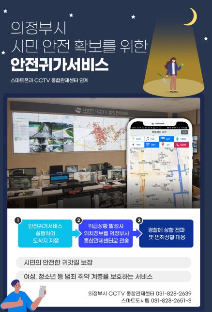 기존에 시행하고 있는‘여성안심귀가 수호천사 서비스’가 심야시간대 자율방범대 차량을 이용 안전귀가를 지원하였다면, 금번 스마트폰 안전귀가서비스는 의정부시 전역은 물론 경기도 시군 15개 어디에서나 스마트폰을 사용해 시군 CCTV관제센터와 연결하여 귀갓길 위급상황에 대응 할 수 있게 했다.