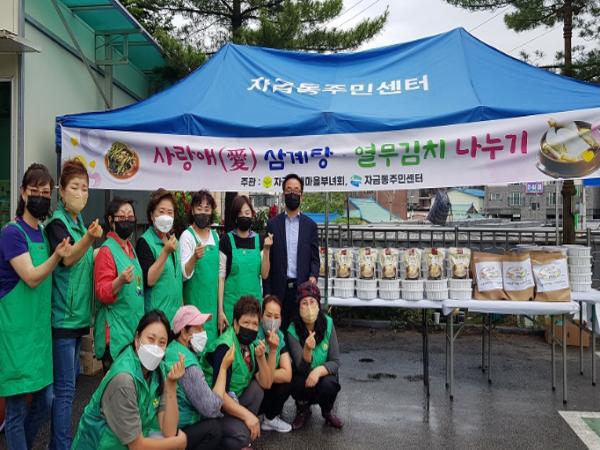 이번 행사에는 새마을부녀회 회원들이 아침 일찍부터 자금동 주민센터에 모여 방역수칙을 준수하면서 직접 열무를 절이고 버무리며 포장하는 작업을 진행했으며, 회원들의 정성으로 담근 열무김치와 삼계탕을 포장하여 곧바로 관내 위기가구 대상자 150가구에 전달했다.