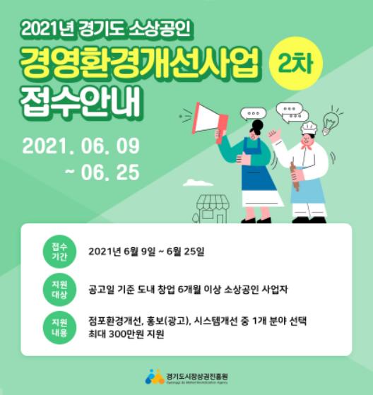 경기도와 경기도시장상권진흥원은 지난 2월에 이어, 코로나19 장기화로 어려움을 겪는 도내 소상공인의 경영 안정화를 위해 추가예산 70억원을 투입하여 ‘경기도 소상공인 경영환경개선사업’ 2차 모집을 6월 9일부터 25일까지 실시한다고 밝혔다.