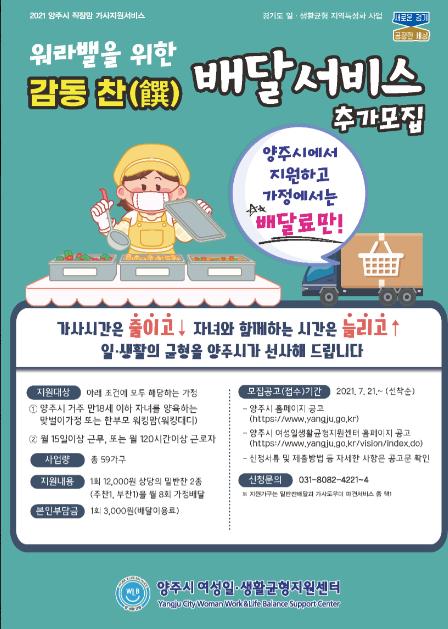 양주시는 21일부터 ‘2021년 직장맘 가사지원서비스 사업’에 참여할 직장맘·대디를 선착순으로 추가 모집한다.