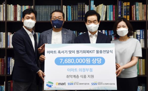 이날 혹서기 맞이 원기회복 키트 전달식은 시장실에서 열렸으며 조진성 이마트 의정부점의 점장 외 강기태 경기도사회복지협의회의 회장, 윤연희 의정부시사회복지협의회의 회장이 참석했다.