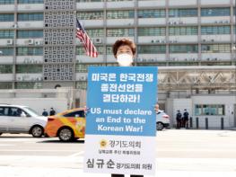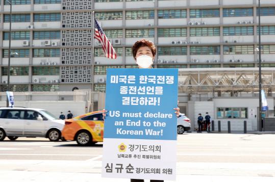 경기도의회 기획재정위원회 심규순 위원장(더불어민주당, 안양4)은 21일 서울 종로에 위치한 미국 대사관 앞 종전선언 촉구 1인 릴레이 시위에 참여하여 “미국은 한국전쟁 종전선언을 결단할 것”을 촉구했다.