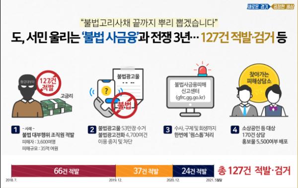 도는 10여차례 기획수사 등을 통해 대부업법 위반으로 2018~2019년 66건, 2020년 37건, 올해 5월 기준 24건 등 총 127건을 적발했다. 이 중 78건이 검찰에 송치되고, 20건이 수사(내사) 중이다.