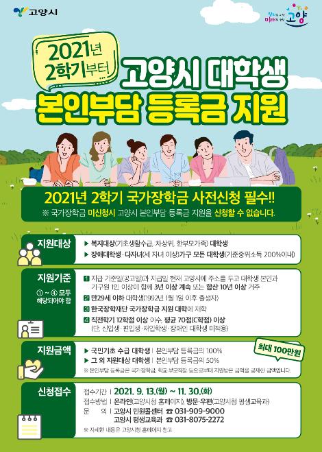 고양시는 2021년 2학기 고양시 대학생 본인부담 등록금 지원 사업을 시행한다고 7월 26일 밝혔다.