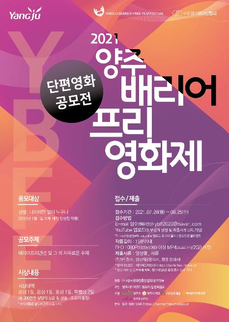 양주시는 오는 8월 25일까지 한국예총양주지회와 한국영화인협회양주지부에서 ‘2021 양주 배리어프리영화제’ 공모전을 개최한다고 밝혔다.
