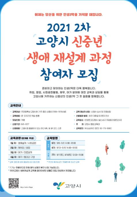 고양시는 오는 8월 6일부터 27일까지 신중년 세대들의 행복한 인생2막을 지원하기 위한 ‘5060 신중년 생애 재설계 과정’제2차 참여자를 모집한다.