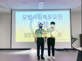 김민철 사회복무요원은 현재 양주시장애인종합복지관 평생학습지원팀 소속의 사회복무요원으로서 파랑새마을, 청소년 방과후 프로그램, 아동 댄스·난타교실 등 각종 프로그램에 참여하여 지역사회 내 장애인 및 가족들이 프로그램을 이용하는 데 어려움이 없도록 보조하고 있으며, 항상 친절하고 밝은 모습으로 이용인에게 먼저 다가가 응대하고 있다.