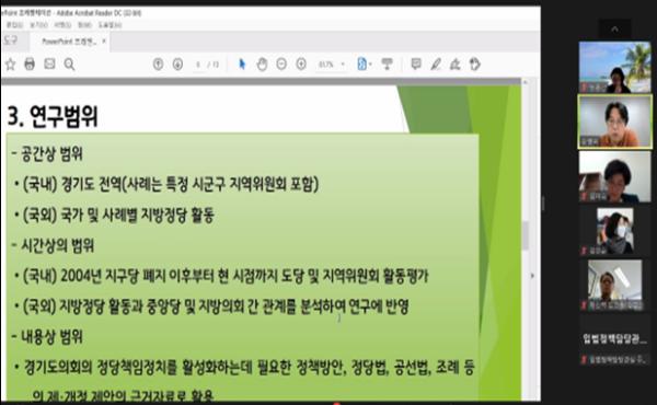 연구진은 주제발표에서 ▲ 지방은 정치의 기본단위로서 중요성이 있음에도 불구하고 지방정치 활성화는 부정적 평가로 인해 지체됨 ▲ 정당은 민주정치의 핵심적인 토대로 지방수준에서 정당정치 활성화가 필요(지구당 부활 등) ▲ 경기도 지역정치 활성화를 위해 경기도 지방정치 활동을 분석하고, 국내외 사례를 검토하여 경기도 의회 정당정치를 활성화 하는 것이 목표라고 발표 하였다.