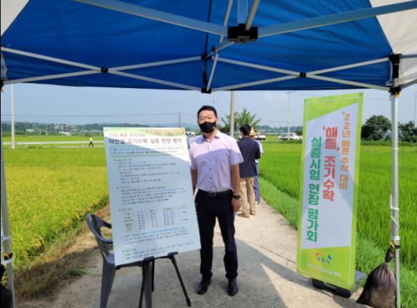 경기도의회 농정해양위원회 김인영 위원장(더불어민주당, 이천2)은 12일 이천시 대월면 송라리 일원에서 열린 이천쌀 ‘해들’ 조기수확 실증시험 현장 평가회에 참석하여 ‘벼 직파재배시험포 현장’ 등을 방문하고 관계자들을 격려하였다.