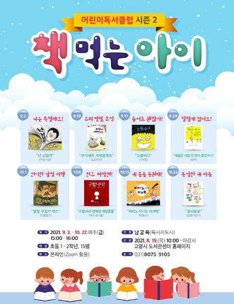 고양시 한뫼도서관이 어린이 독서문화 활성화를 위하여 9월부터 8주간 어린이독서클럽 시즌 2 「책 먹는 아이!」를 온라인으로 운영한다.