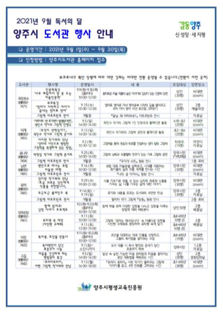 교육은 오는 9월 1일부터 30일까지 진행되며 참여를 희망하는 시민은 양주시도서관 홈페이지에서 마감 시까지 온라인 접수하면 된다.