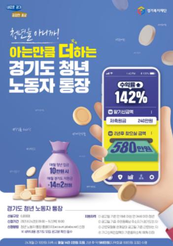 ‘경기도 청년 노동자 통장’은 청년이 2년 동안 근로활동을 유지하면서 매달 10만원을 저축하면 경기도 지원금과 이자 등을 합쳐 2년 후 약 580만원(지역화폐 100만원 포함)의 목돈을 지급하는 청년 지원 사업이다.