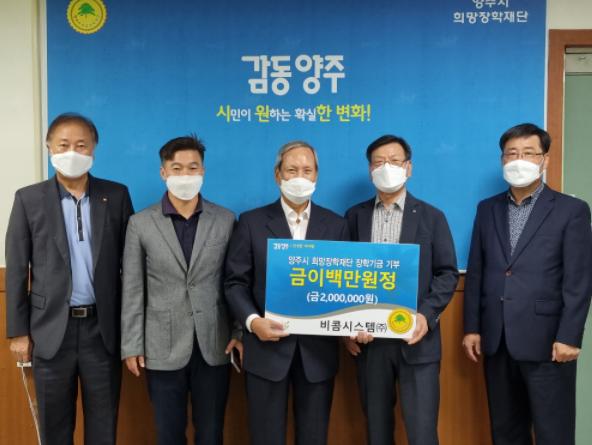 양주시희망장학재단(이사장 임충빈)은 19일 비콤시스템(주)(대표 신제원, 심범수)에서 지역인재육성을 위해 써달라며 장학금 200만원을 기탁했다고 밝혔다.