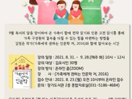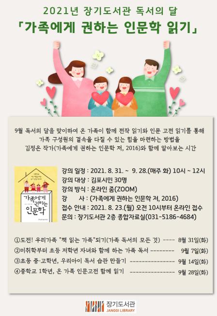 김포시 장기도서관은 2021년 9월 독서의 달을 맞이하여 2021년 8월 31일부터 9월 28일(매주 화요일) 오전 10시부터 12시까지 총 4회에 걸쳐 김포 시민을 대상으로 '가족에게 권하는 인문학 읽기' 강연을 운영한다.