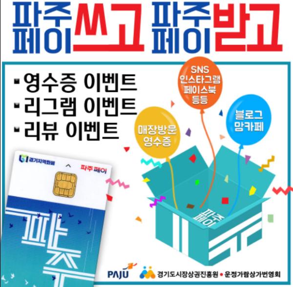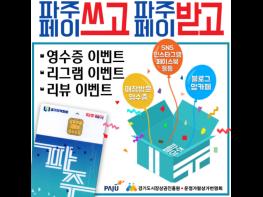 파주페이 영수증 이벤트는 파주페이로 1만원 이상 결제한 고객을 대상으로 영수증 응모 및 추첨을 통해 5만원 상당의 파주페이를 지급하는데, 지난 17일 150명을 추첨으로 뽑았고 순차적으로 지급하고 있다. ‘리그램 이벤트’는 파주페이 이벤트 포스터를 인스타그램 등 SNS에 업로드하면 휴대용 소독제를 경품 소진 시까지 지급한다. 리뷰 이벤트는 9월 30일까지 파주페이 영수증 이벤트에 대한 내용을 블로그, SNS, 맘카페 등에 리뷰를 올린 고객 중 선정해 파주페이 10만원권을 지급한다.