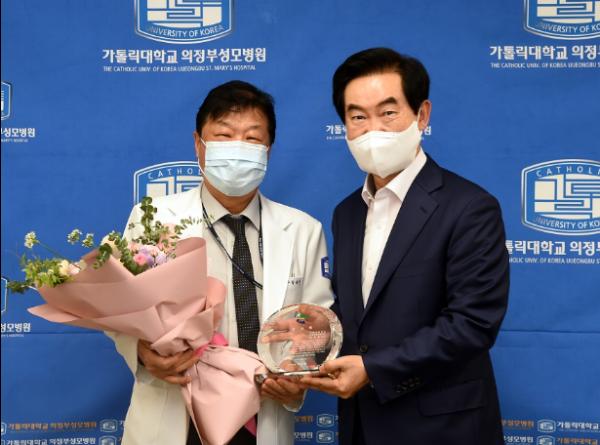 안병용 의정부시장은 8월 30일 의정부성모병원을 방문해 올해 8월 말로 4년의 임기가 만료되는 박태철 의정부성모병원장에게 감사패를 전달했다.