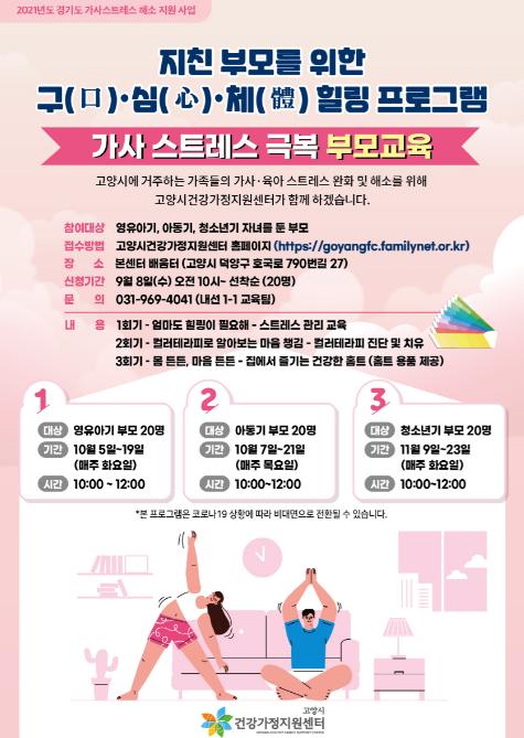 고양시 건강가정지원센터가 경기도의 지원을 받아 가사스트레스 해소 지원사업인 ‘지친 부모를 위한 구(口)·심(心 )·체(體) 힐링 프로그램’을 운영한다.