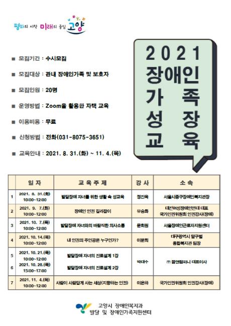 고양시가 관내 장애인 가족과 그 보호자를 대상으로 ‘2021년 장애인가족 성장교육’을 비대면으로 진행한다.
