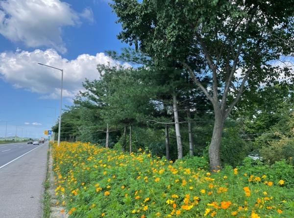 파주의 관문 자유로에 황화코스모스가 활짝 펴, 가을의 정취를 물씬 느낄 수 있다.