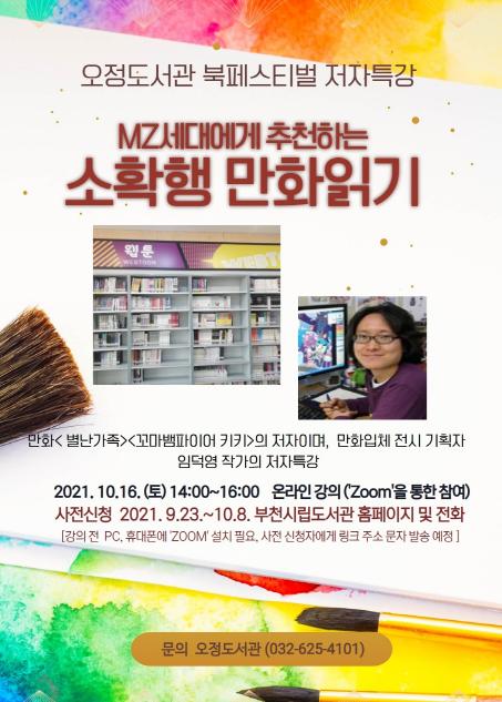 오는 10월 16일에는 부천의 만화작가 임덕영 저자가 ‘MZ세대에게 추천하는 소확행 만화 읽기’를 주제로 다양한 독서 방법과 부천에 소재한 만화 관련 정보시설을 소개한다.