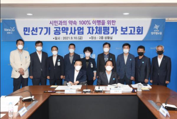 양주시는 10일 시청 상황실에서 ‘민선 7기 공약사업 자체평가 보고회’를 열고 사업별 진행현황을 중점 점검하는 시간을 가졌다.
