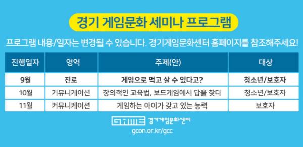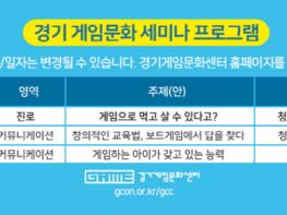 월 1회 진행되는 ‘경기 게임문화 세미나’는 게임을 잘 이해해 자녀와 소통하고 싶은 보호자와 향후 게임과 관련된 직업을 갖고 싶은 청소년 등을 위해 비대면 온라인 생방송으로 진행되는 게임 진로·커뮤니케이션 세미나다.