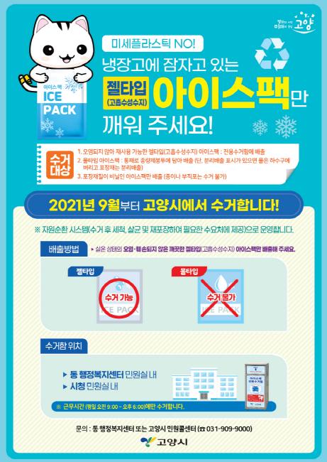 고양시가 전체 39개 동 행정복지센터와 시청 민원실 내부에 아이스팩 전용 수거함을 설치를 완료해 13일부터 오는 12월 12일까지 시범 운영한다.