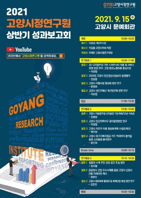 고양시정연구원은 9월 15일 2021년 상반기 연구실적 성과보고회를 개최한다고 밝혔다.