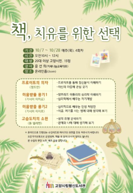고양시 행신도서관은 성인을 대상으로 10월 7일부터 심리학 도서를 활용한 독서심리치유 프로그램인 ‘책, 치유를 위한 선택’을 운영한다.